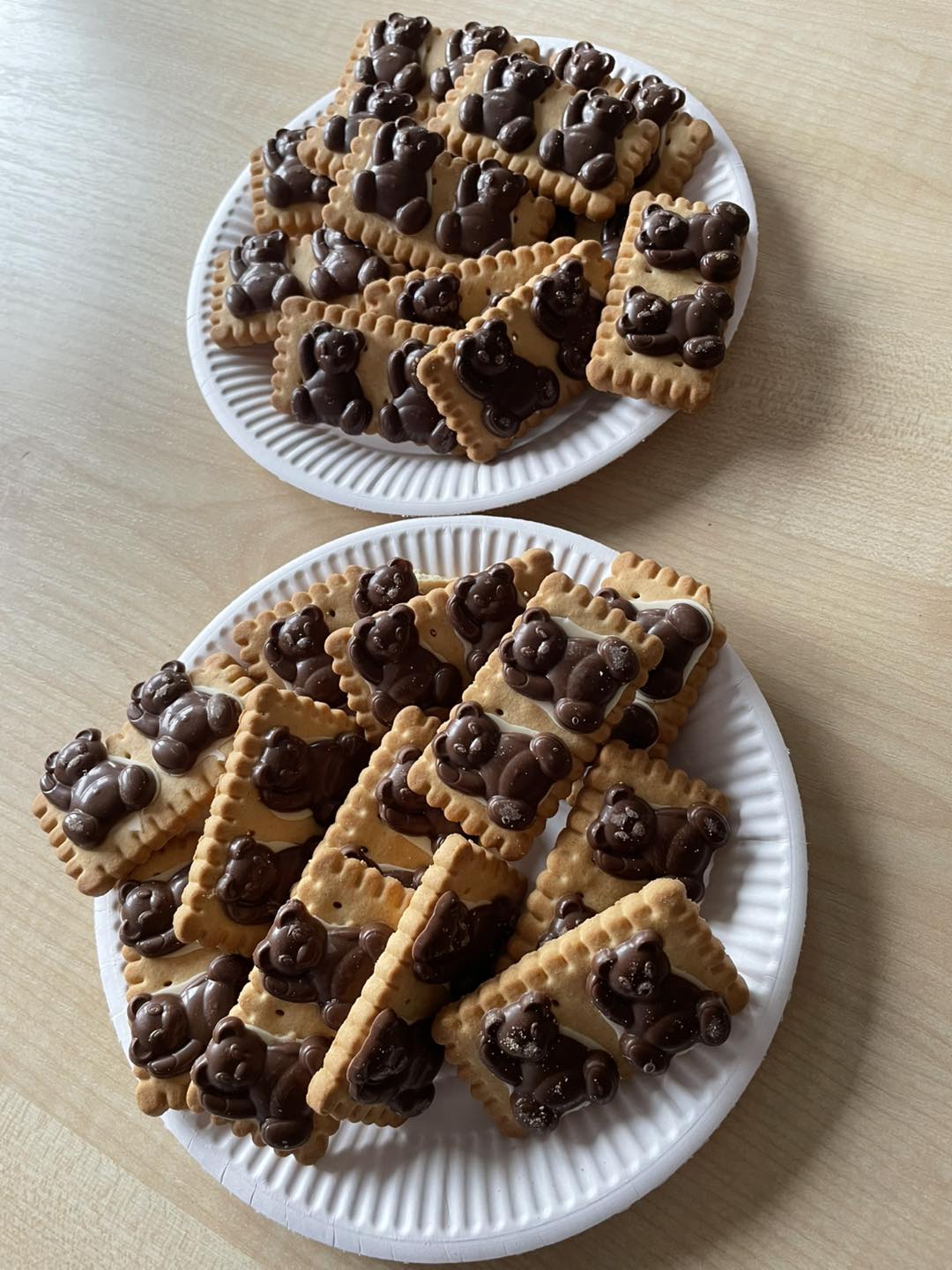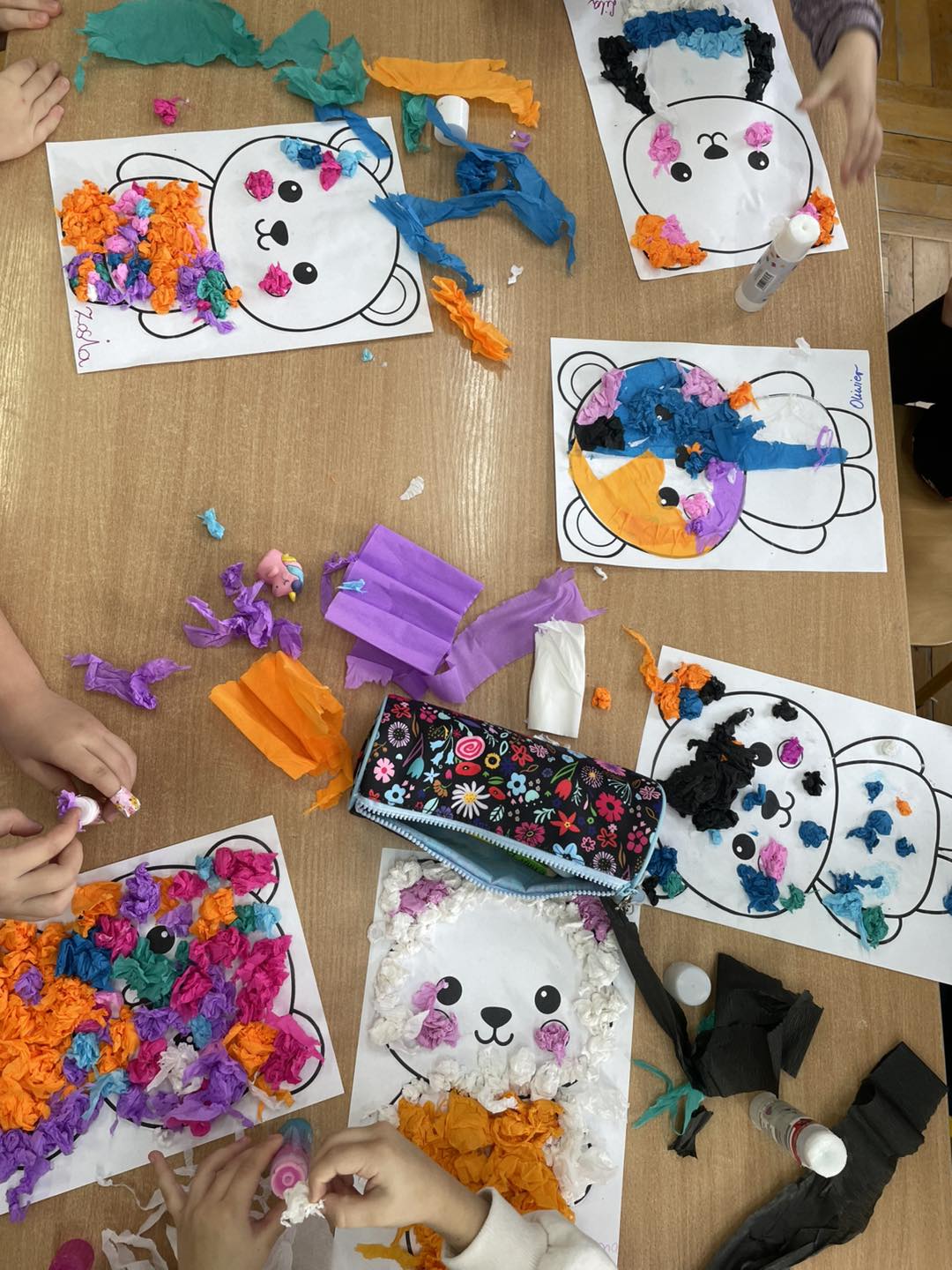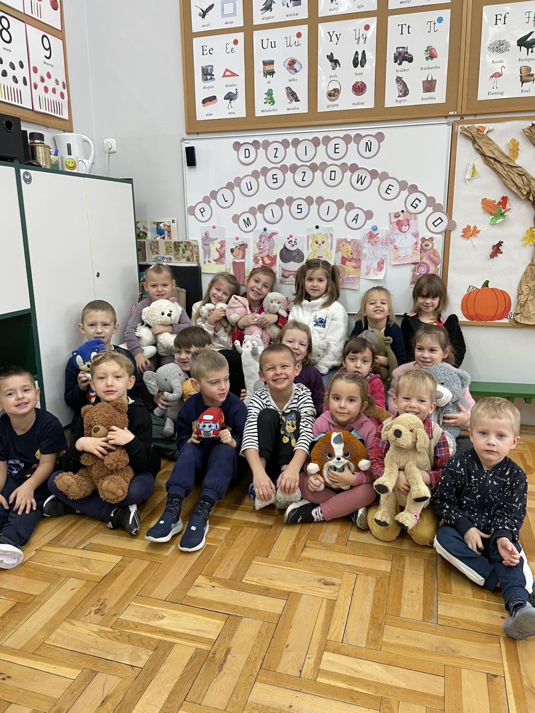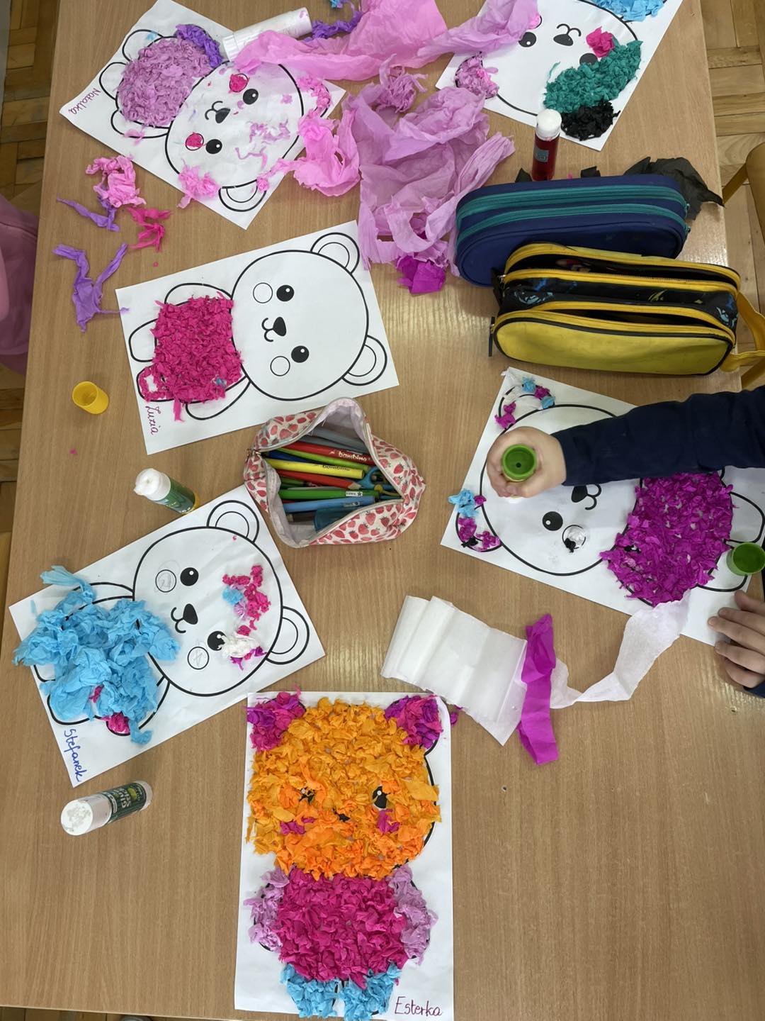 Najpierw dzieci poznały historię pluszowego misia oraz obejrzały edukacyjny film pokazujący, jak powstaje ta ulubiona zabawka wszystkich przedszkolaków. Następnie każdy wykonał własną pracę plastyczną – misia wyklejanego kolorową bibułą. Po obiedzie czekała na nas słodka niespodzianka – ciasteczka z misiami, które wszyscy zjedli ze smakiem!