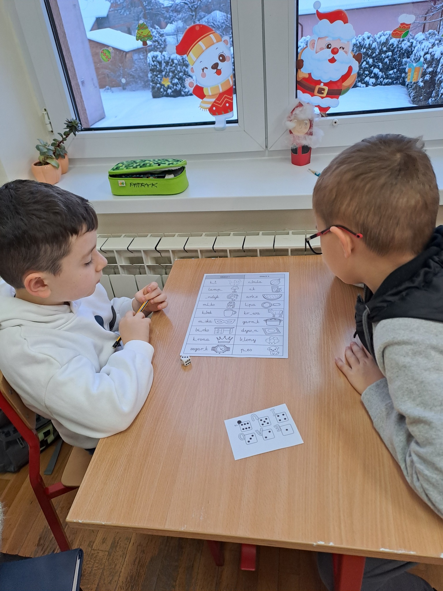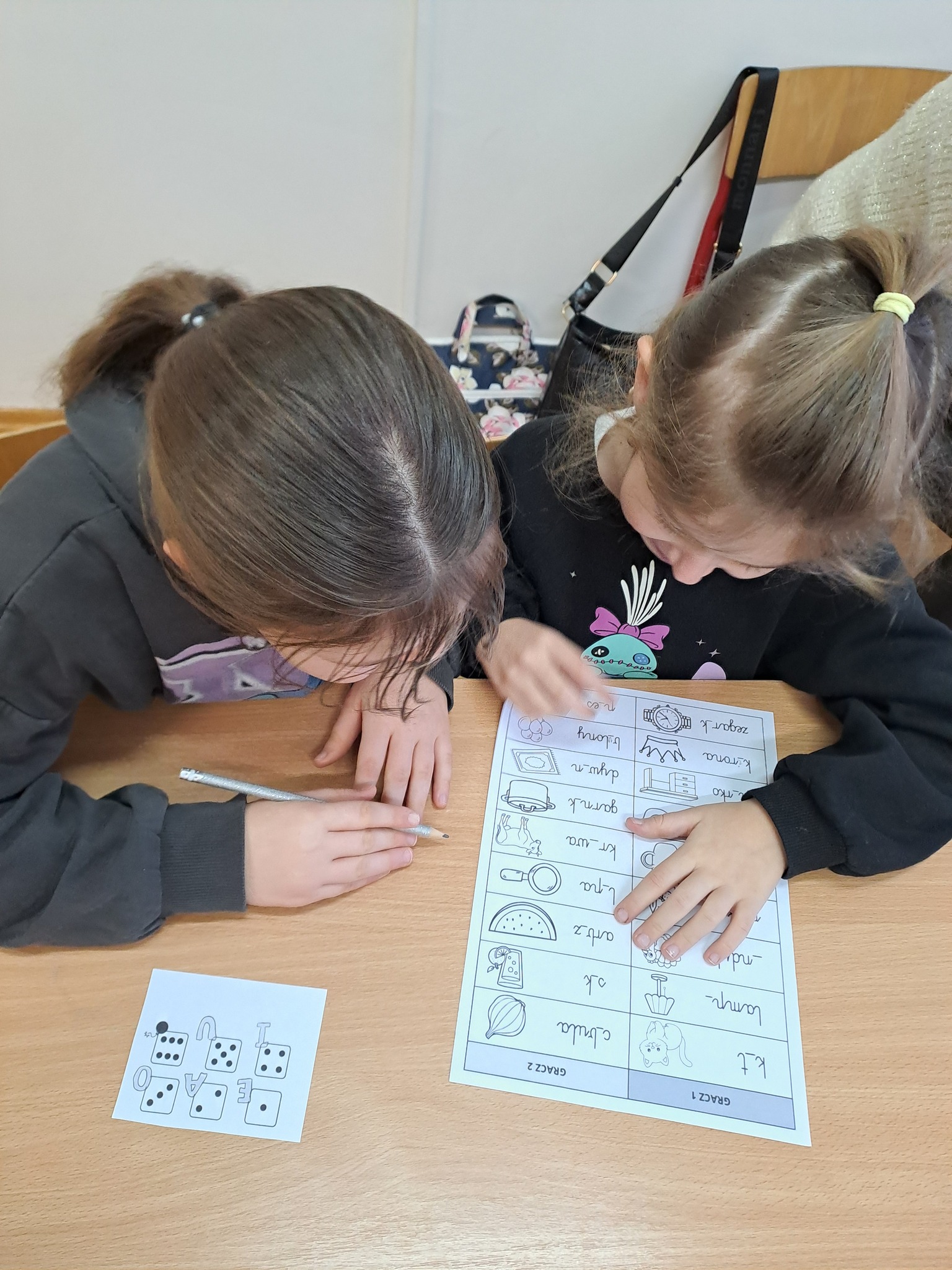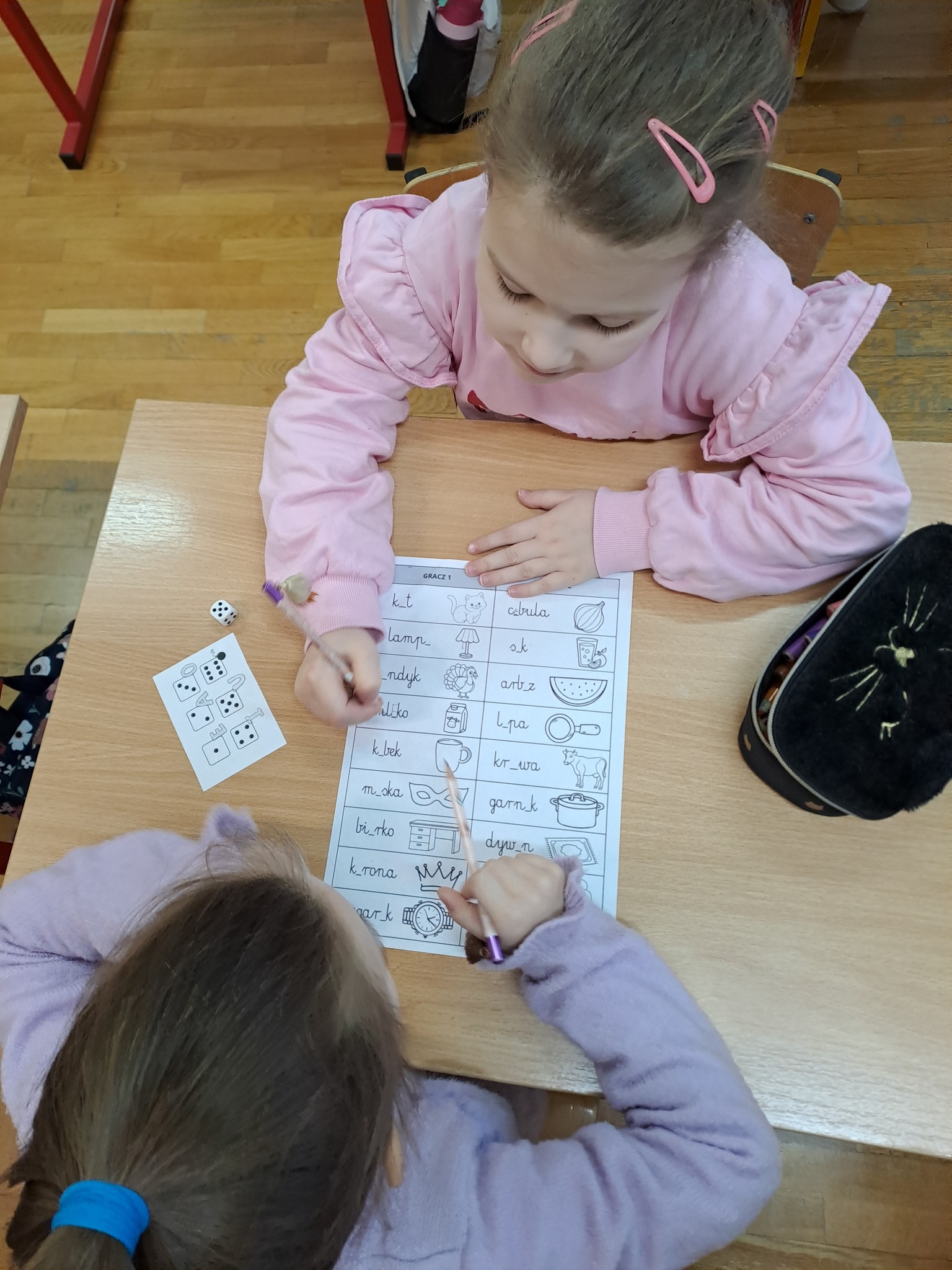 Pierwszoklasiści wykonali ćwiczenie językowe, którego celem było utrwalanie znajomości samogłosek oraz doskonalenie analizy słuchowo-wzrokowej wyrazów.