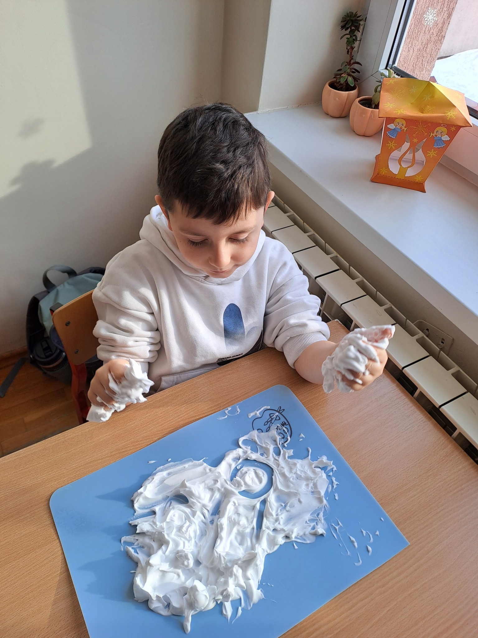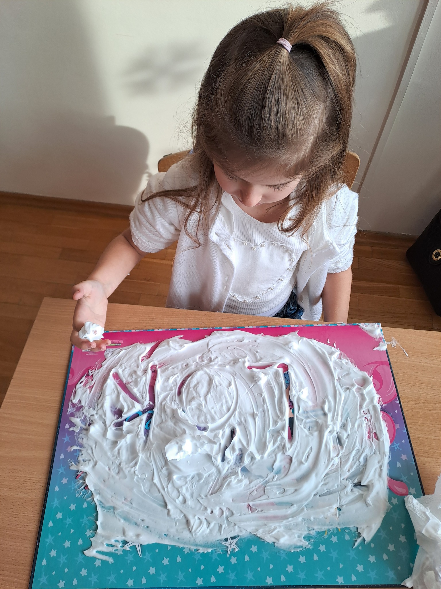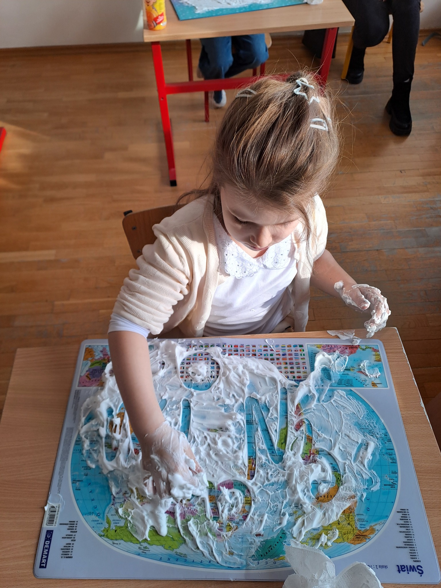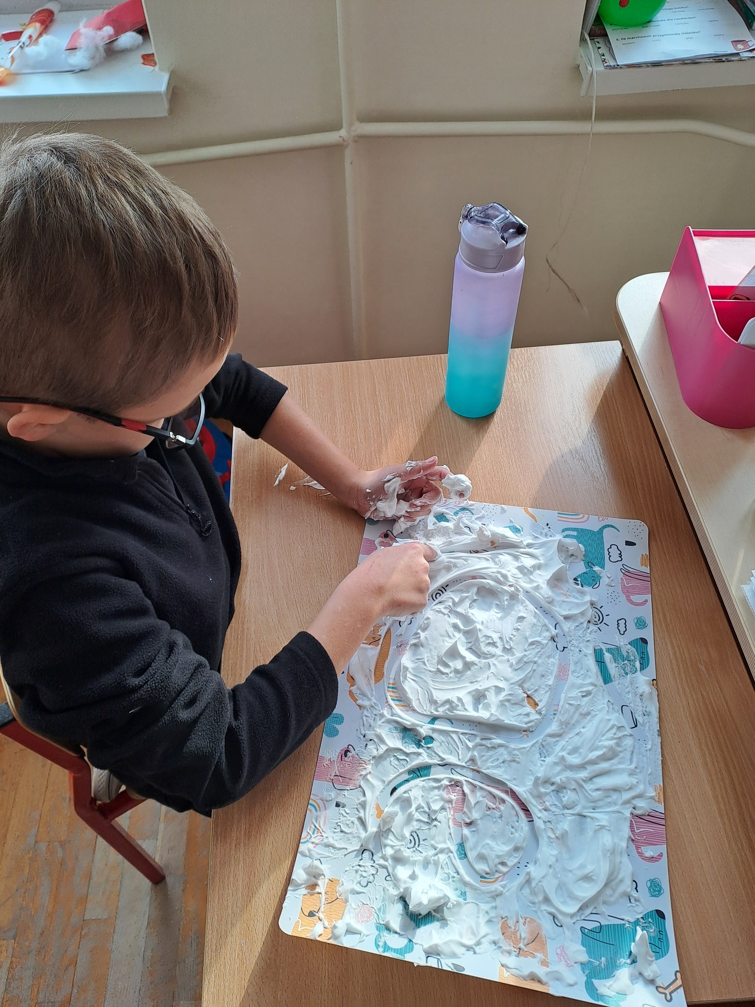 Pianka do golenia połączyła naukę liter z zabawą sensoryczną. Uczniowie rozsmarowali piankę na przygotowanej powierzchni, a następnie pisali litery i wyrazy, utrwalając ich kształt w atrakcyjny sposób.