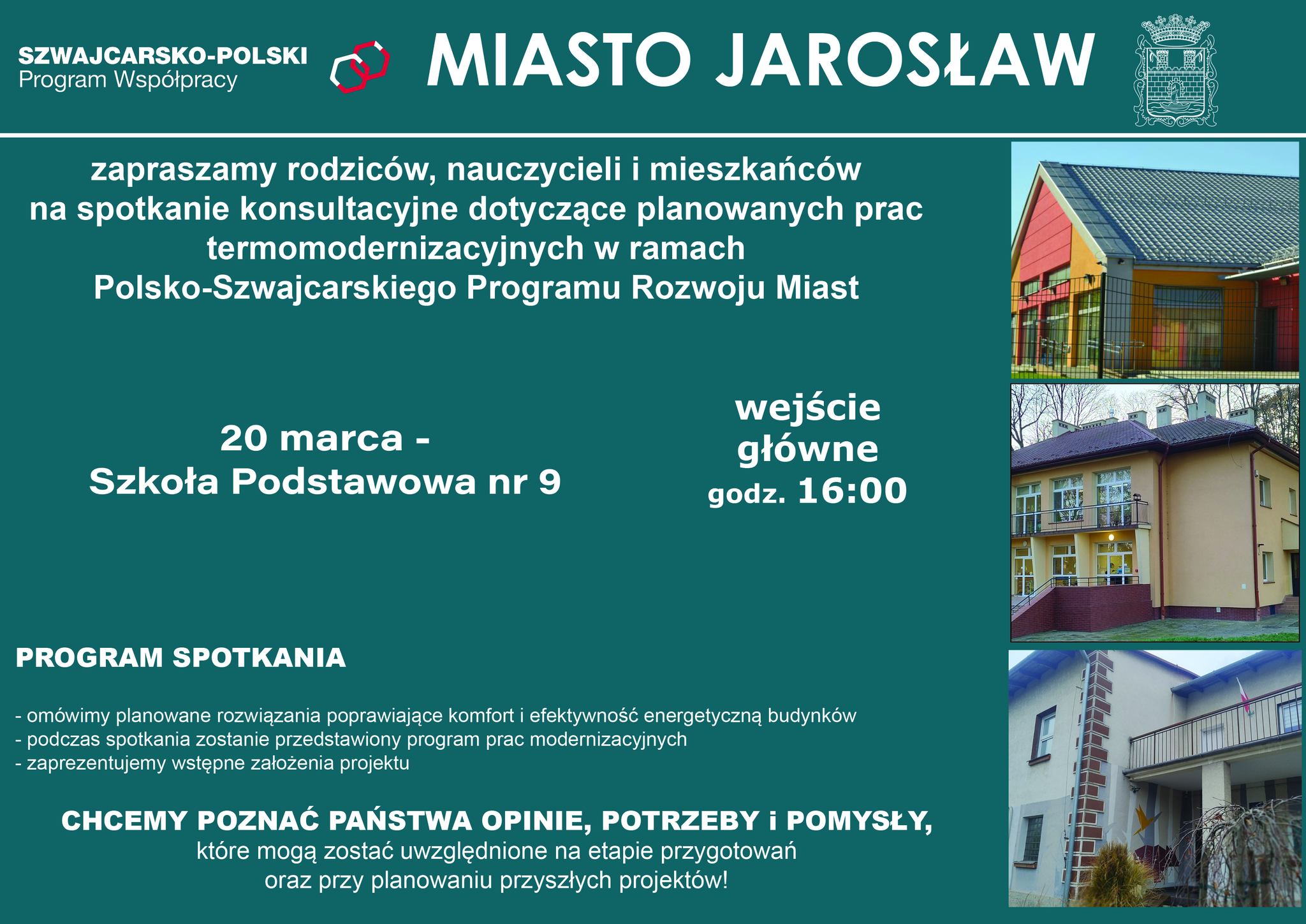 Miasto Jarosław serdecznie zaprasza rodziców, nauczycieli i mieszkańców na spotkanie konsultacyjne dotyczące planowanych prac termomodernizacyjnych w ramach Polsko-Szwajcarskiego Programu Rozwoju Miast.