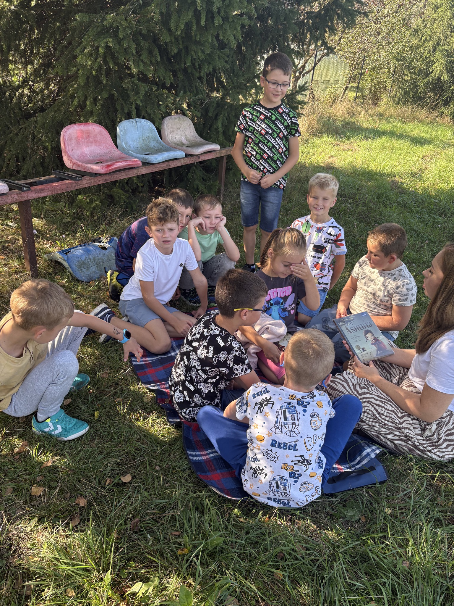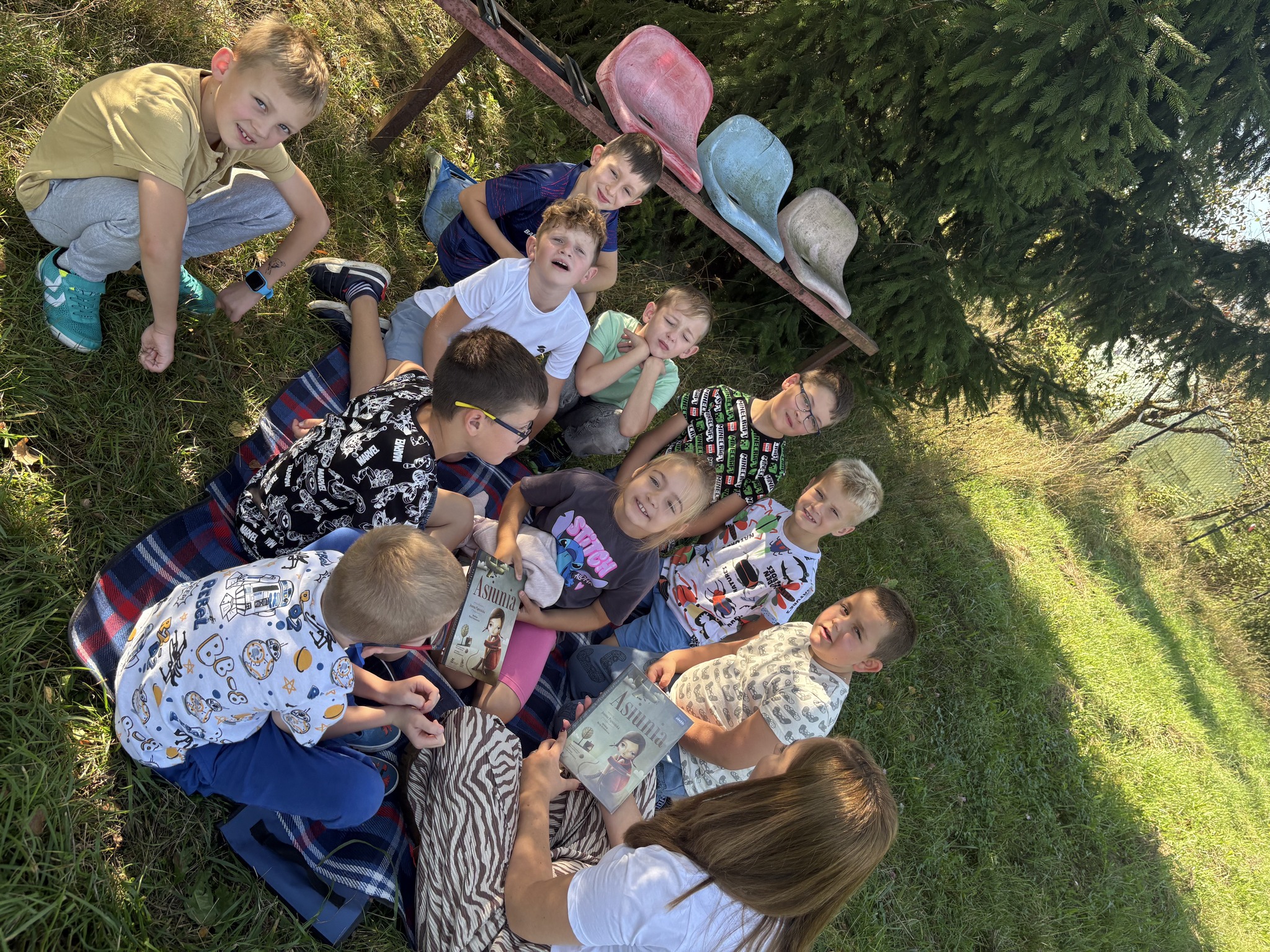 Piękna, słoneczna pogoda stworzyła idealne warunki do niezwykłej lekcji - wspólnego czytania lektury "Asiunia" na świeżym powietrzu.