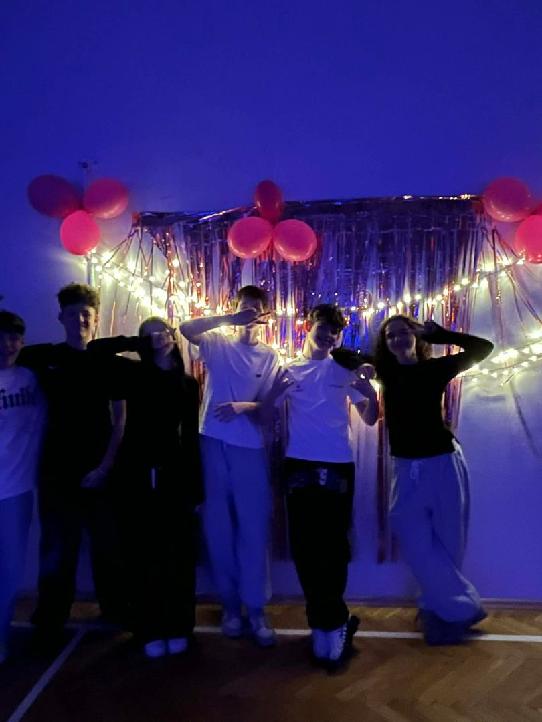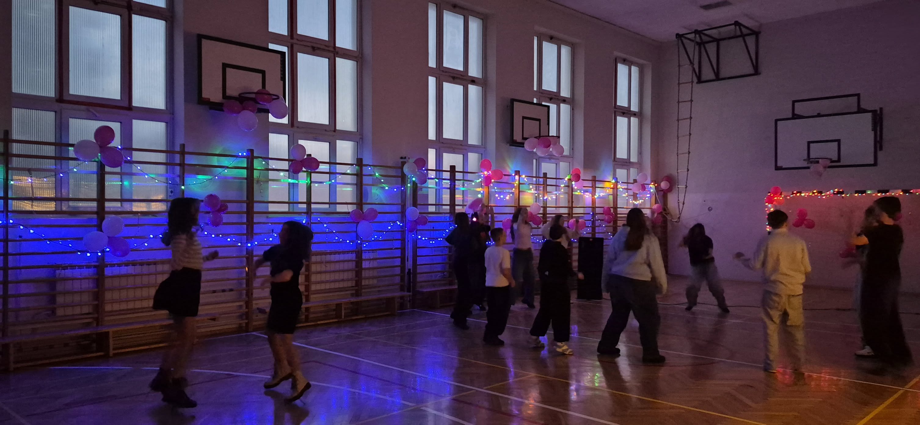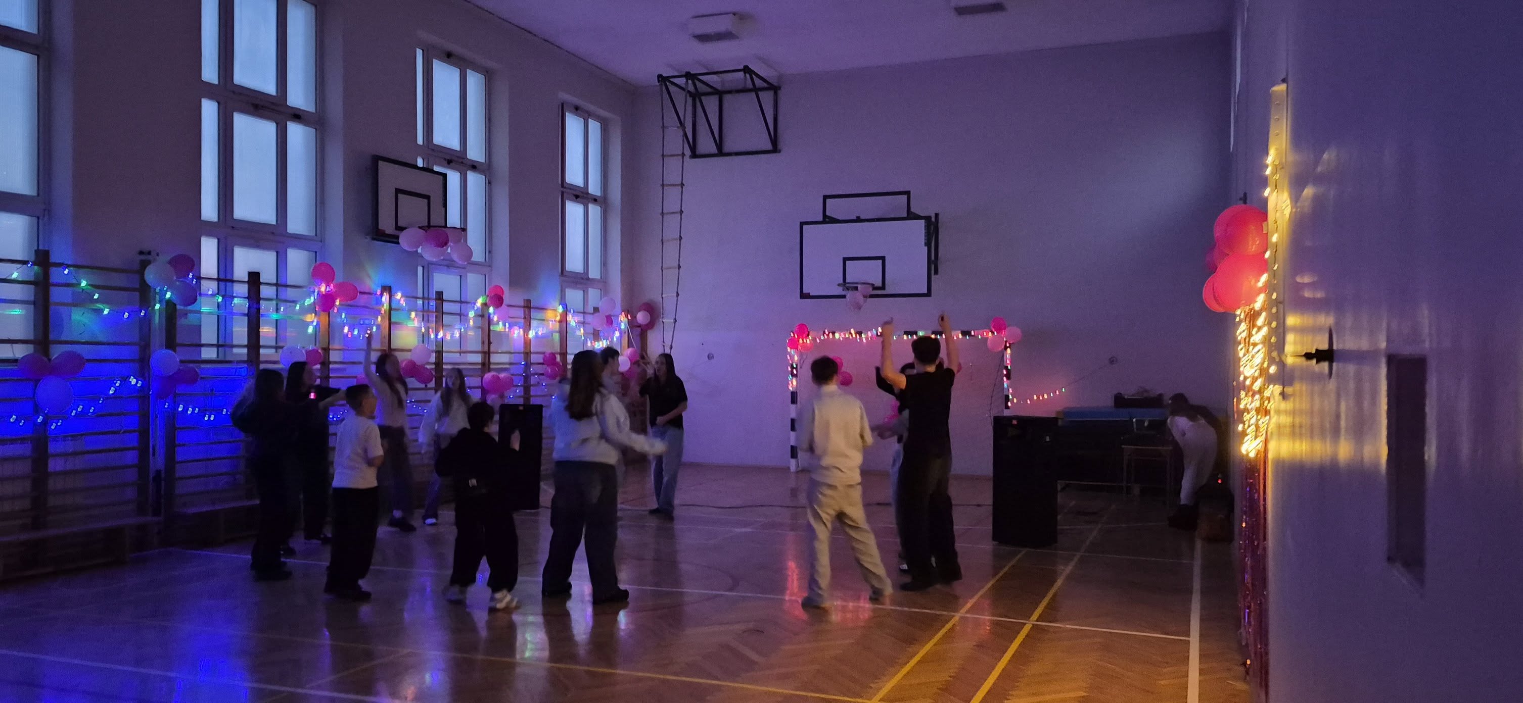 Tuż przed feriami – 13 lutego, w piątkowy wieczór, odbyła się wyjątkowa zabawa walentynkowo-karnawałowa, która na długo pozostanie w pamięci wszystkich uczestników. Był to czas pełen niesamowitej radości, uśmiechu i pozytywnej energii. Sala została pięknie udekorowana przez uczniów różowymi balonami i kolorowymi lampkami i już jej wygląd wprowadził wszystkich w doskonały nastrój. Wszyscy – od najmłodszych do najstarszych –bawili się doskonale. Szczególnie miłym i wzruszającym momentem było wręczanie walentynek. Dla wielu osób była to chwila pełna emocji, zarówno dla tych, którzy otrzymywali kartki z życzeniami, jak i dla tych, którzy je przygotowali. Ten drobny gest życzliwości i sympatii wywołał wiele uśmiechów oraz sprawił, że atmosfera stała się jeszcze bardziej serdeczna.